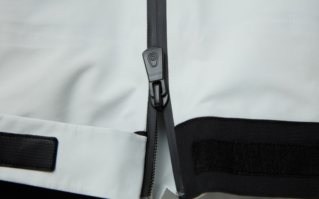 The pants are equipped with reinforced oxford nylon fabric on the inside of the inside of the leg ends and have two water-resistant zippers on the outer side with an inner placket that allows for a wider leg opening. The leg openings can also be adjusted with Velcro for a customized fit that prevents water and wind intrusion.